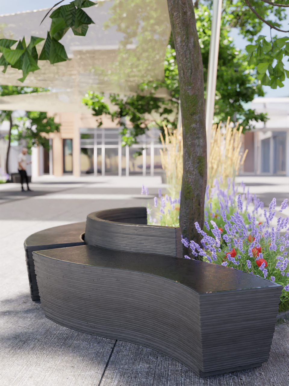 Le projet transforme la place en un lieu vibrant et agréable, symbolisant le dynamisme de Boucherville. Le mobilier en béton imprimé en 3D, associé à une végétation soigneusement pensée, crée un espace public moderne, durable et convivial.